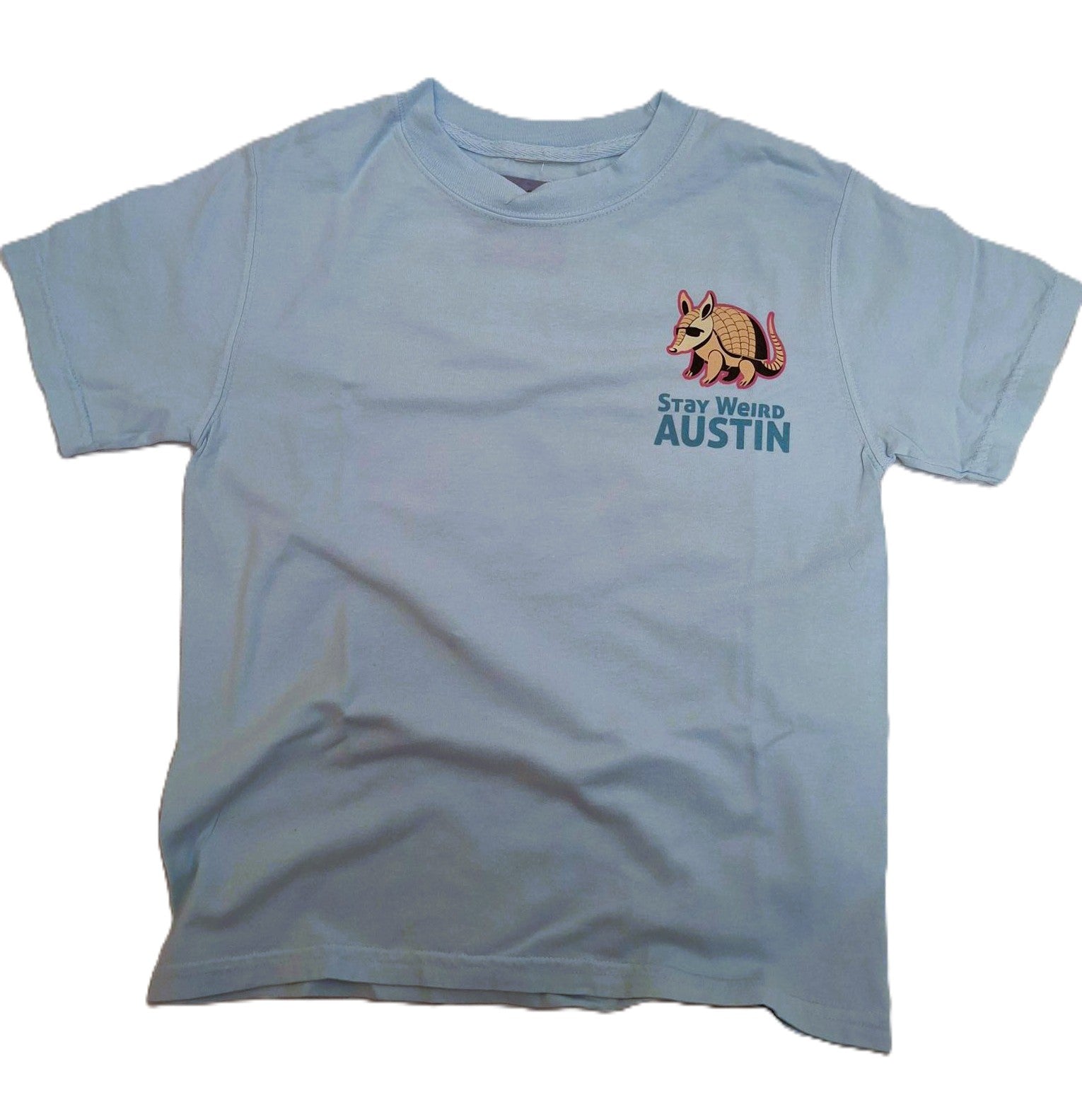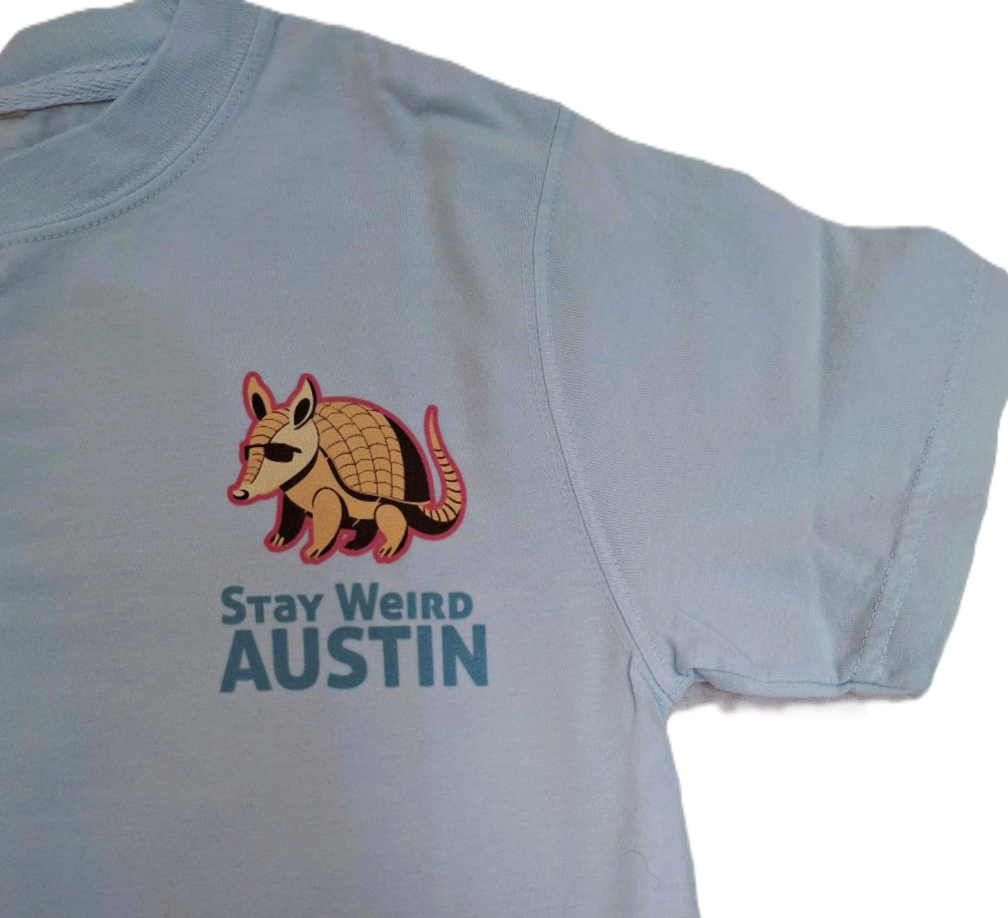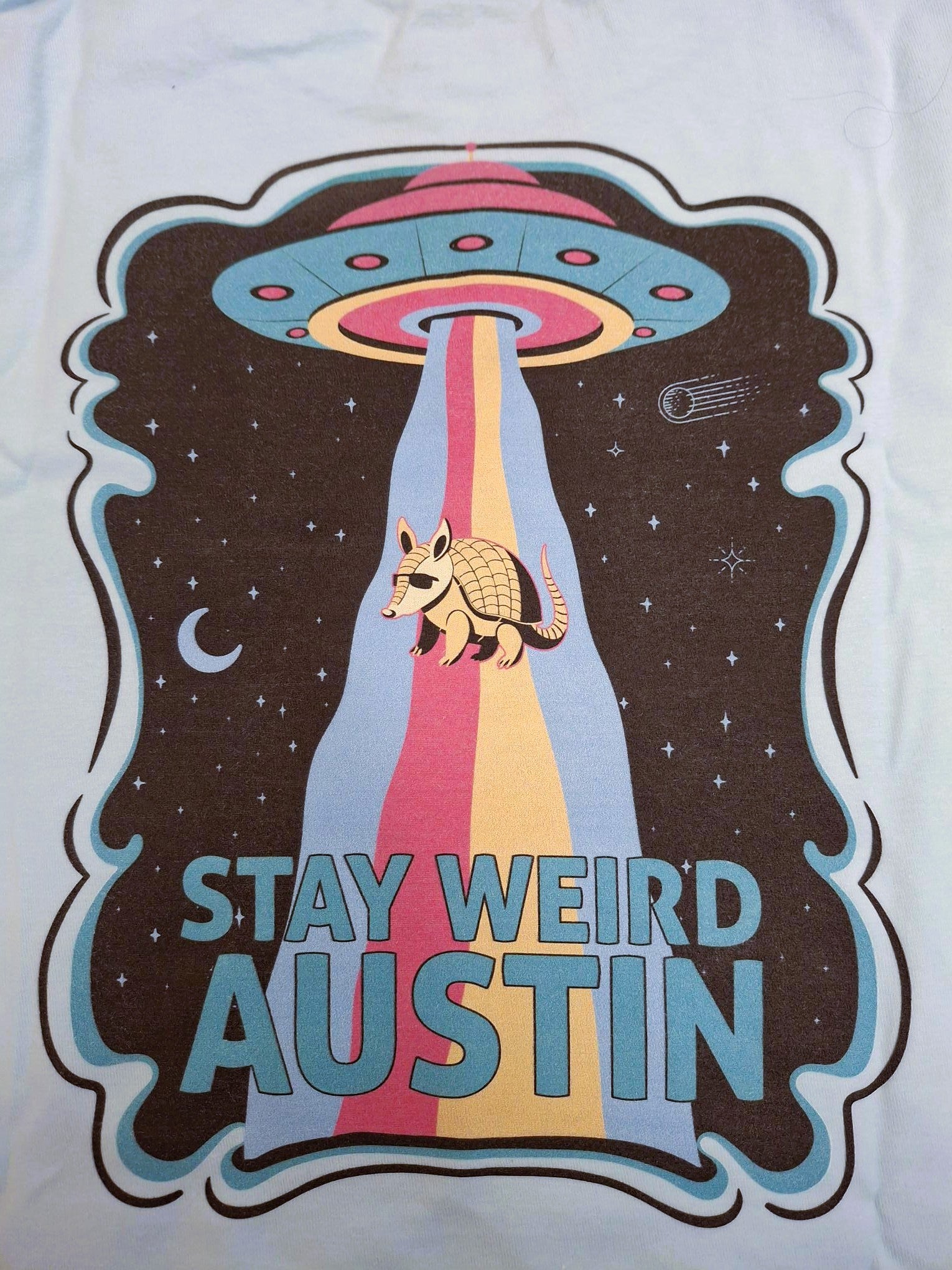 On the front, a tiny, mysterious armadillo is rocking some shades with the words "Stay Weird Austin" underneath—a fun, subtle nod to our city's famous motto.