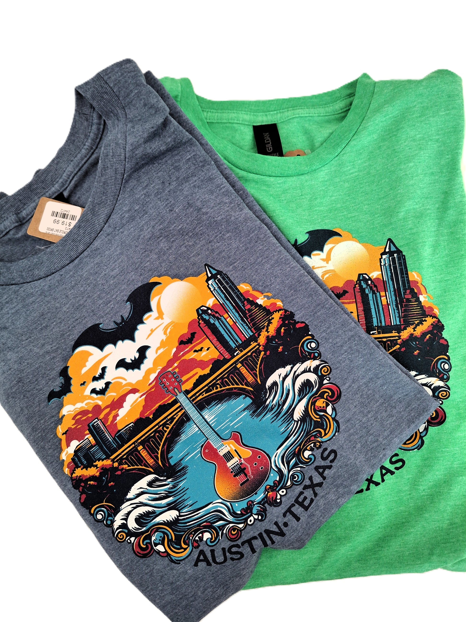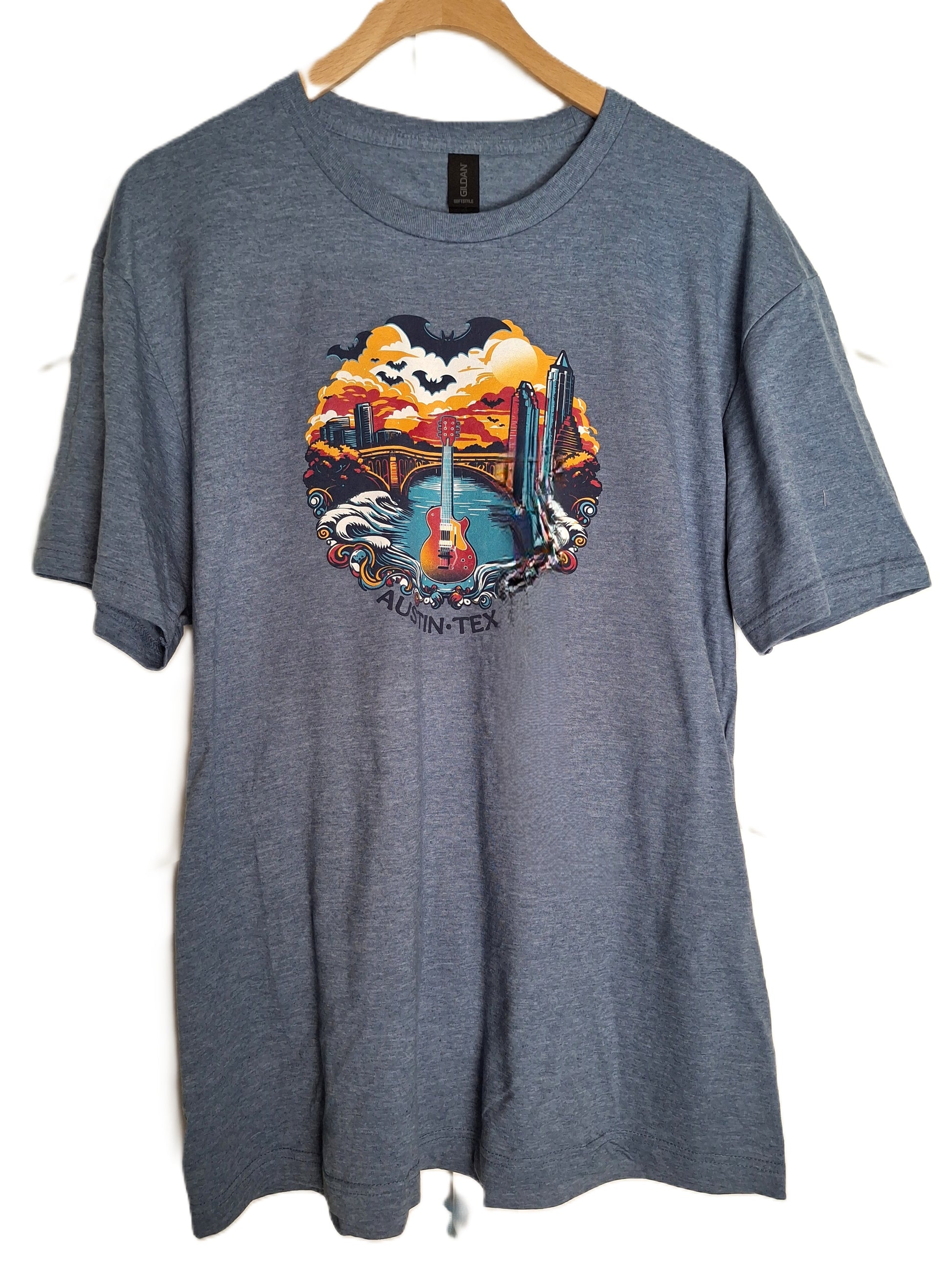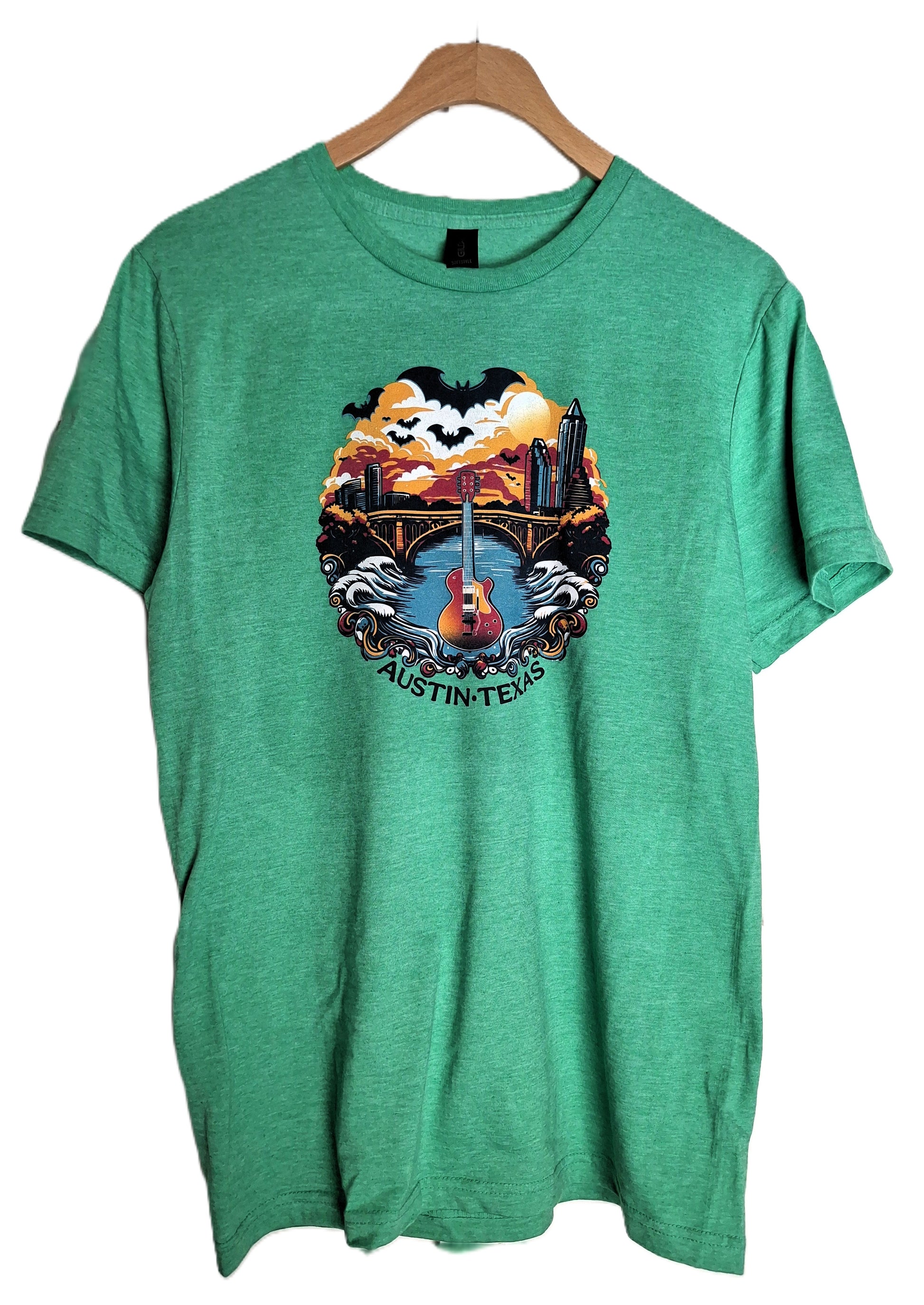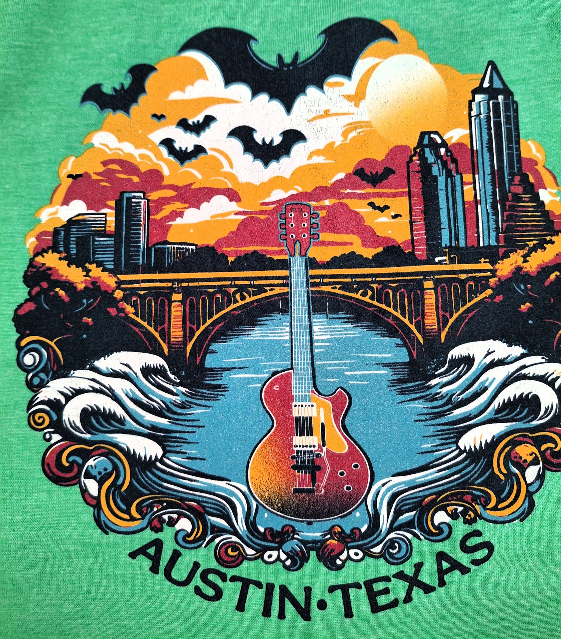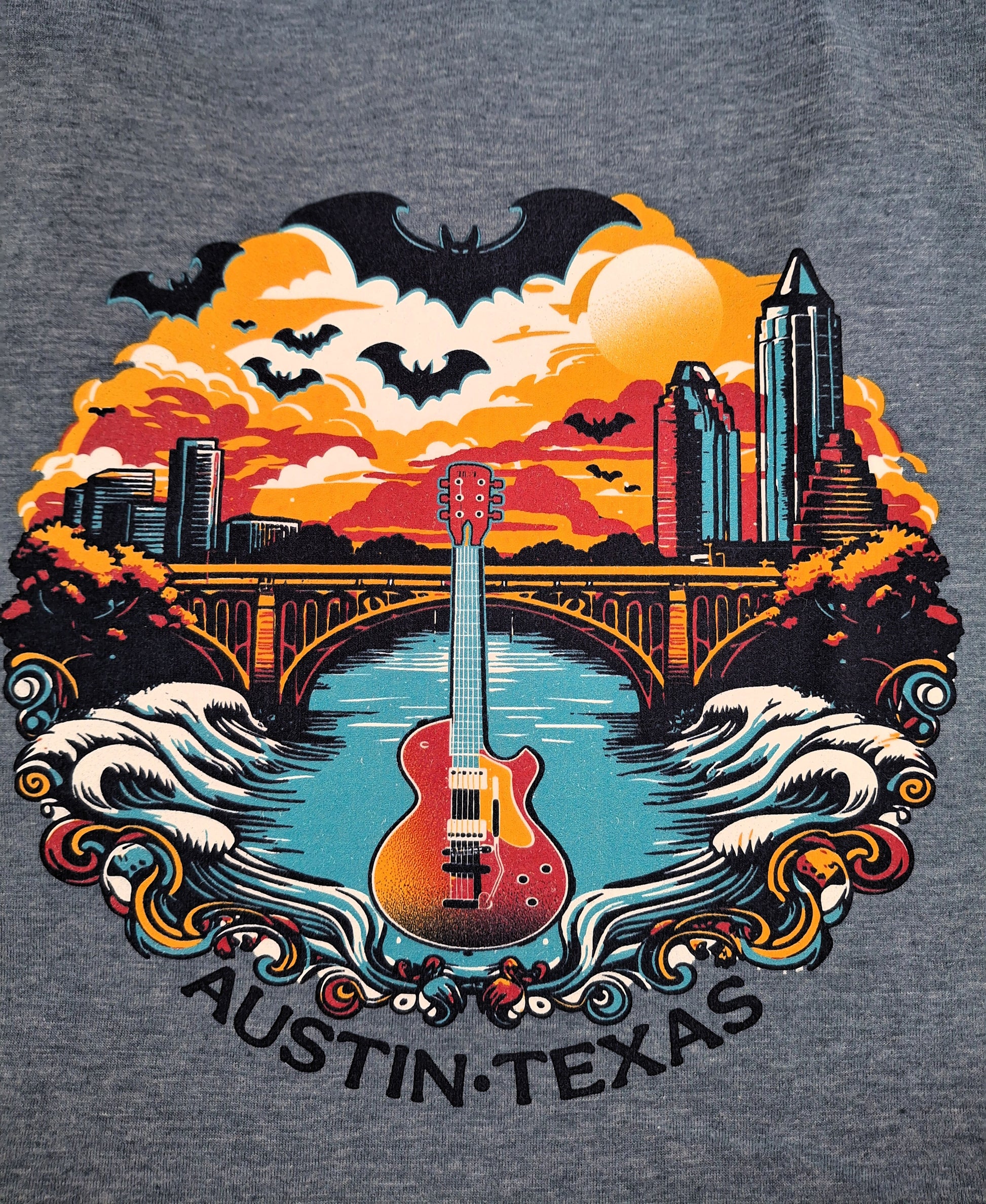 Unleash your inner music lover with our exclusive Austin-Texas themed t-shirts! These shirts feature a vibrant, one-of-a-kind design that perfectly captures the unique and eclectic spirit of the city. The artwork depicts a majestic electric guitar front and center, rising from the waters of Lady Bird Lake, with the iconic Congress Avenue Bridge and the downtown skyline in the background.
