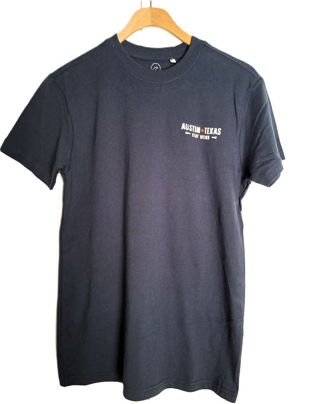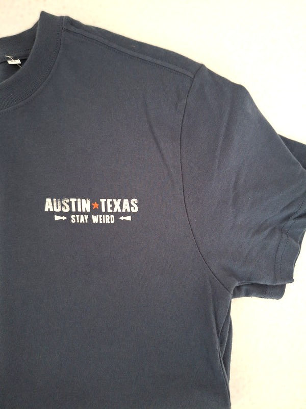 Ready to wear your Austin pride on your sleeve—and your back? This awesome navy tee is more than just a shirt; it’s a tribute to the city we love. On the front, a subtle nod to our roots with a clean "Austin, Texas" and a not to our famous mantra, "Stay Weird."