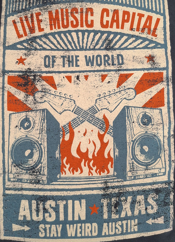 But flip it around and the party starts! The back features a bold, distressed-style graphic that screams Austin's soul. You've got crossed guitars blazing over flames, flanked by massive speakers—a perfect symbol of our epic music scene. The whole design is framed with bold text declaring Austin the "Live Music Capital of the World."