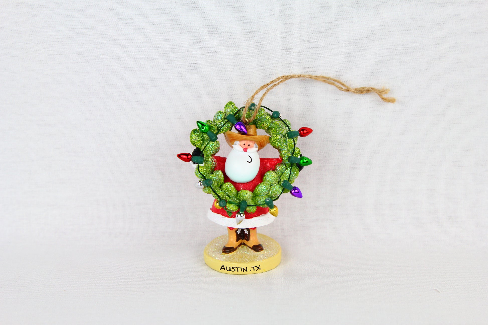 Bring a little bit of Austin Texas cheer to your holidays with this adorable ornament featuring Santa carrying a Prickly Pear Cactus Wreath festooned with lights.